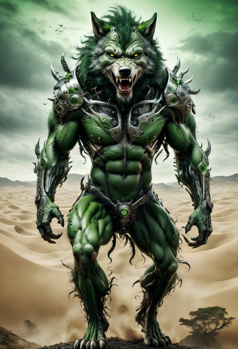 ultra-high quality, ultra-detailed image of a hybrid mechanical wolfman, hybrid creature, mid male human, mid Wolf, seamlessly blending mechanical and organic elements, dark and green colors, commanding presence, capturing her entire body, Face: Highly detailed, lifelike features with expressive, piercing eyes that convey her strength, fierce, showing a natural blend of mechanical and organic textures, vast, desolate desert of dunes, evoking an abandoned planet, barren landscape.