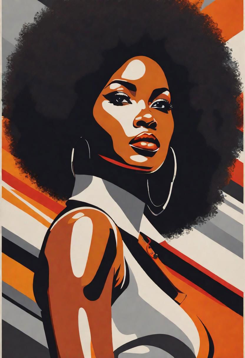 1970s style, retro-poster in the colors, orange, black, red, white, and gray, an African American woman, with a curvy figure and big afro, action scene