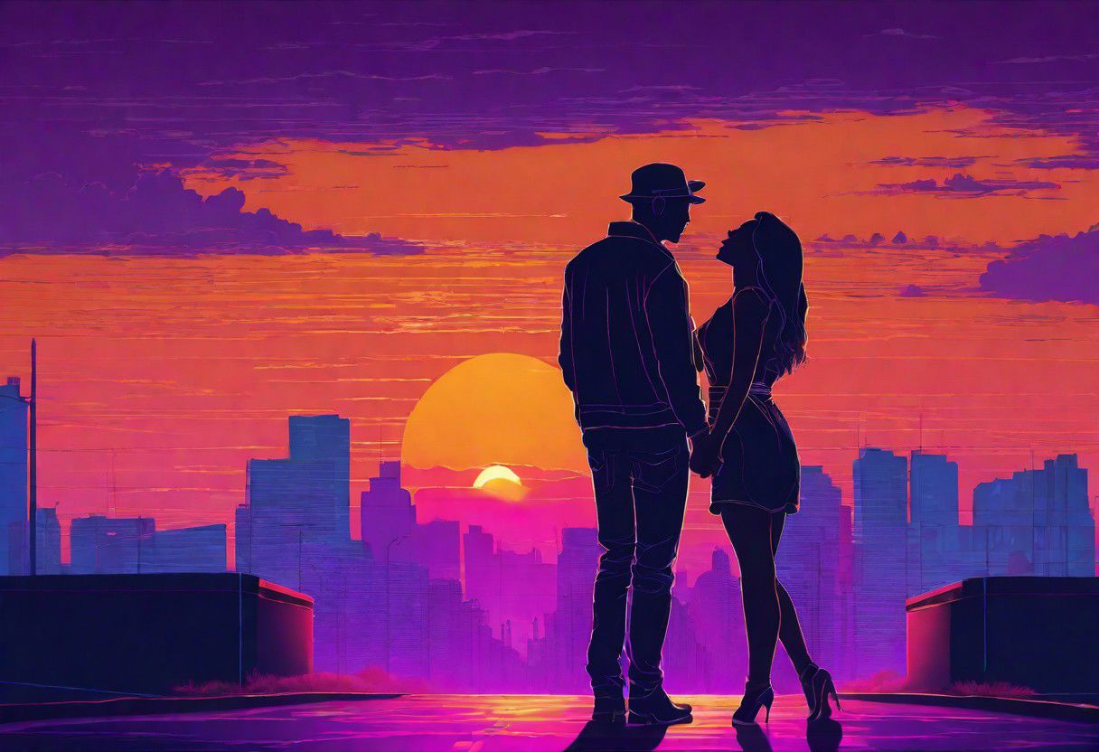 San valentino, couple kissing, silouette, synthwave, wireframe, sunset, piurple/orange sky, virtual sun, road in the city ultrarealistic, hyperrealistic, real person, high detailed skin, high detailed figure, hd, (masterpiece, sidelighting, finely detailed ), hdr, realistic painting, natural skin, textured skin