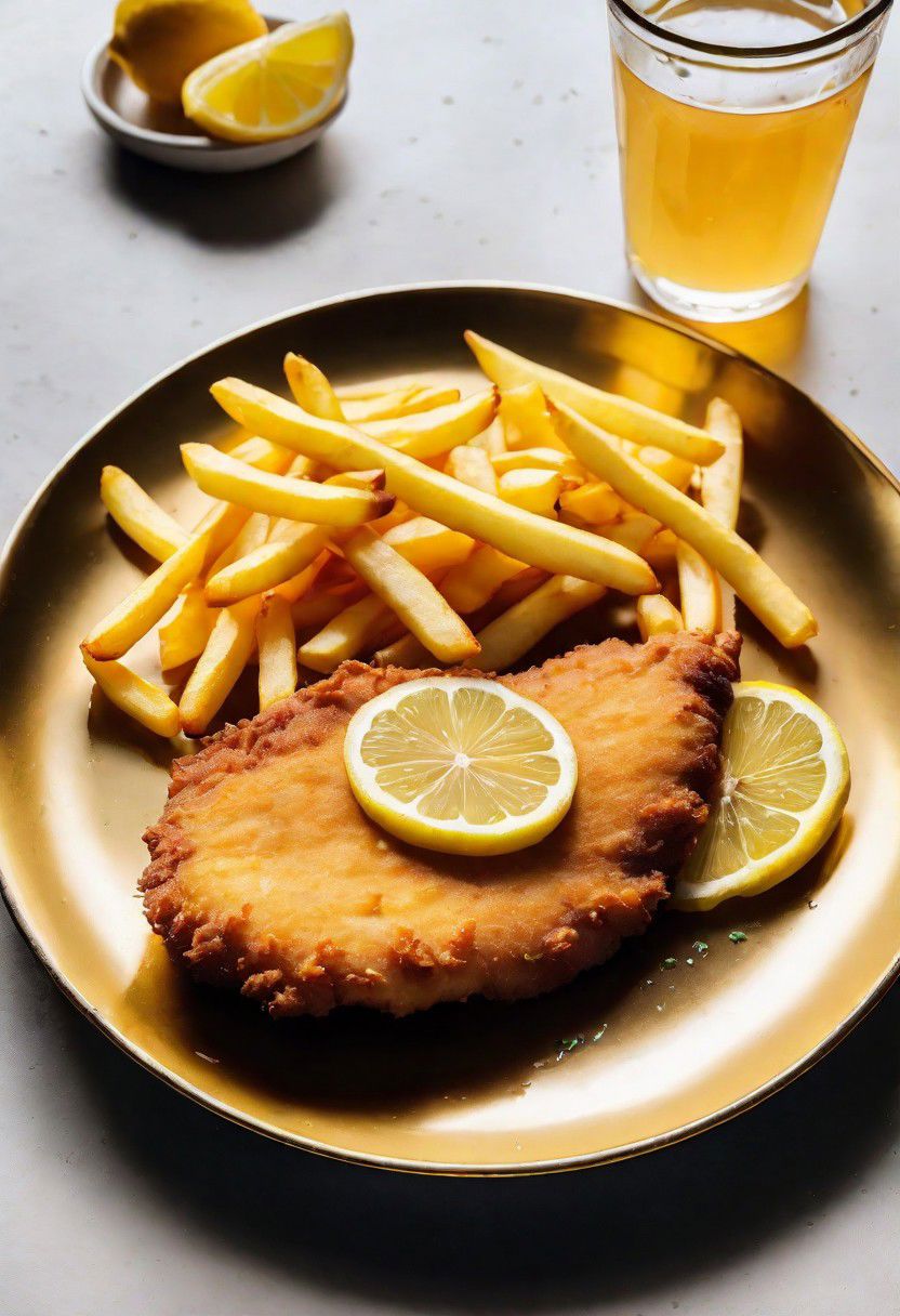 A wiener schnitzel with fries Fritz and half a small lemon on the side, on a golden plate,