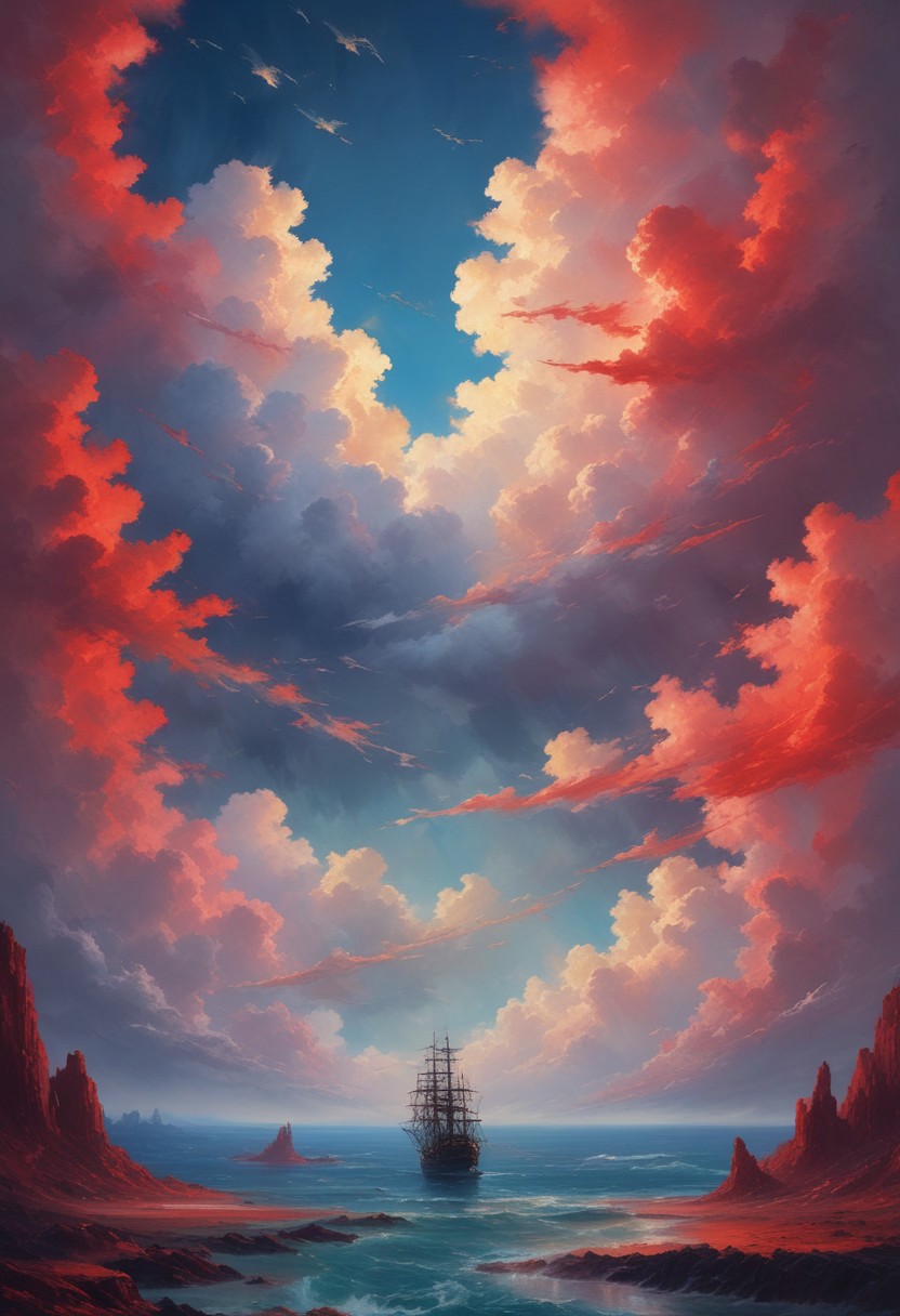 ASCII /1/ (masterpiece, best quality, very aesthetic, absurdres, 3d, realistic:1.2), (beautiful detailed eyes;HDRI glares in the eyes:1.5), /2/ perspective view, low angle, sweeping circling composition, /3/ (monster forming out of the clouds:1.5), /4/ (cloud elemental, red eyes:1.5), /5/ Non-representational, colors and shapes, expression of feelings, imaginative, at sea, outdoors, detailed background, /6/ clouds parting casting shafts of sunlight, /7/ iridescent, Abstract style, cute, colorful and vibrant, mystical colors, contemporary impressionism,
