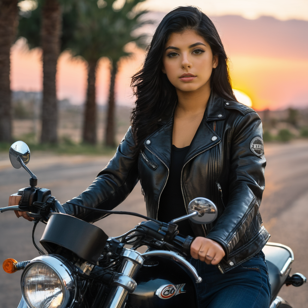 a photo of gina valentina, ohwx, a woman riding a motorcycle, wearing a leather jacket, best quality, cinematic lighting, sunset <lora:ginavalentina_SDXL:0.7>