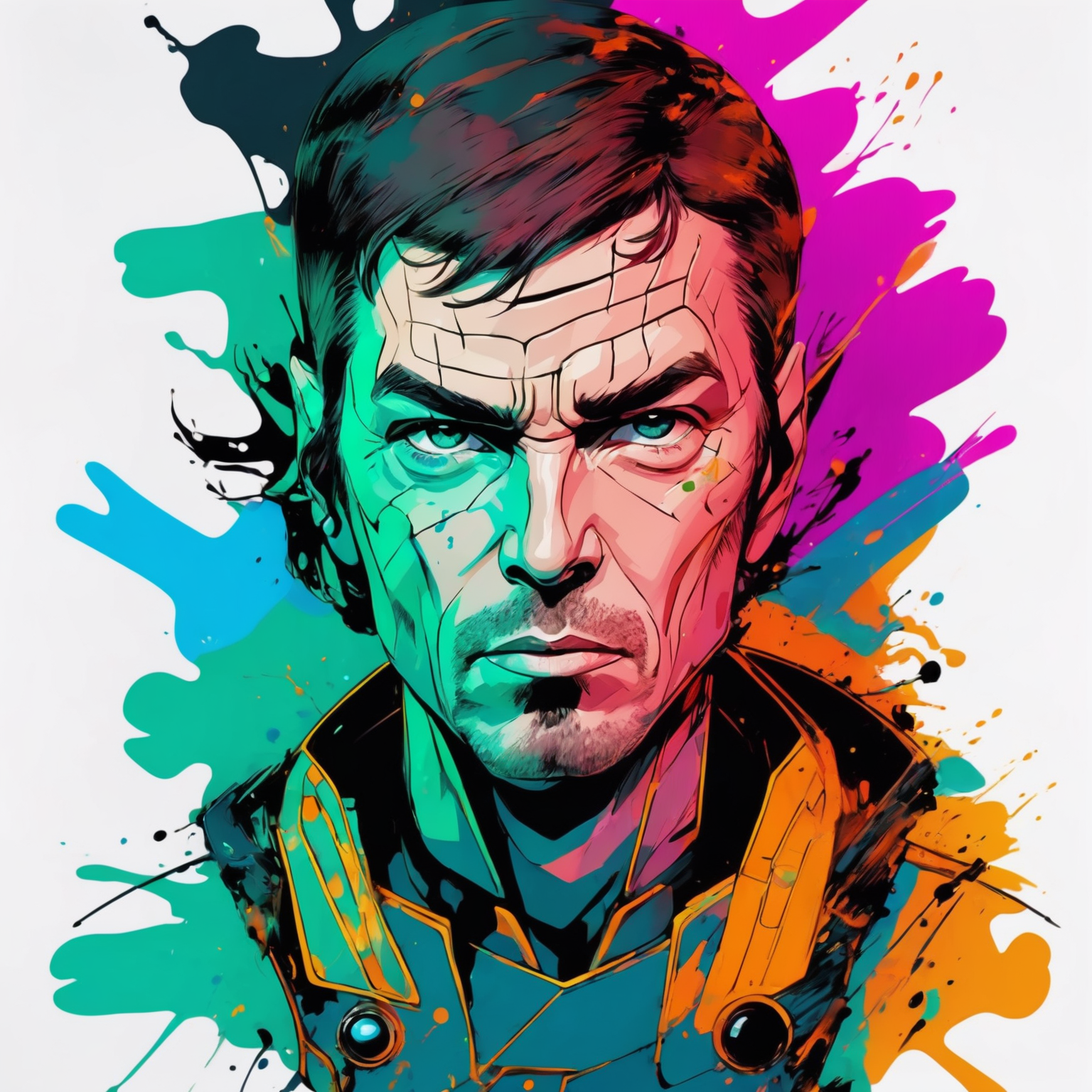 nvinkpunk, star trek, kirk, spock, bones, uhura, paint splashes, splatter, outrun, vaporware, dynamic pose, cell shaded, black orange and green background, (octane render:1), trending on artstation, highly detailed, fine detail, intricate, (masterpiece:1.2), best quality