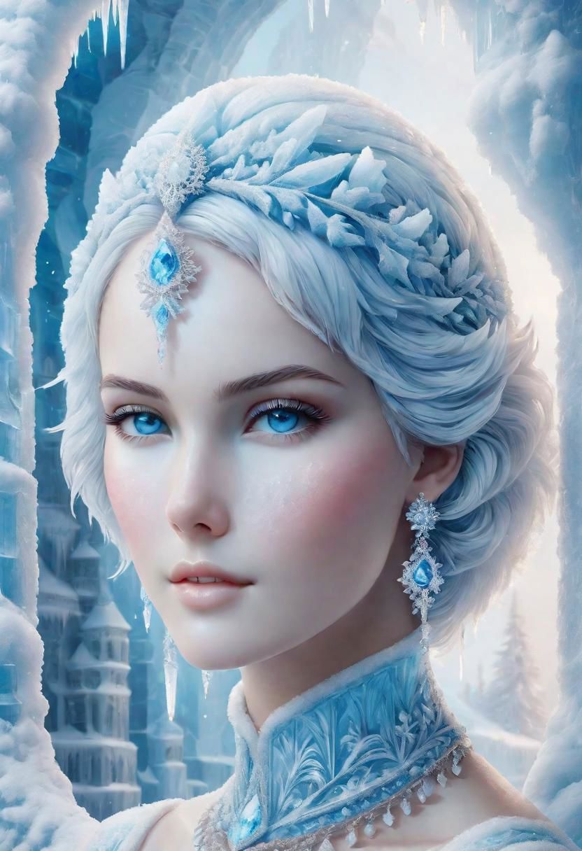 detailed illustration, beautiful girl, made of ice, straight short iced hair, ral-glacial, wearing a formal white dress with crystal parts, light blue eyes, glowing eyes, ice wizard, sorceress, (background of a frozen room:1.3), (wearing saphire jewelery:1.2)