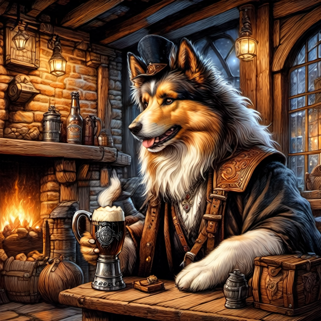 fantasy anthropomorphic rough collie warrior in dark tavern holding a pint of ale in a cozy environment with gas lamps rustic wood warm brick fireplace and frosted glass windows, Masterpiece realistic, best high quality, perfect details, intricate details, nice lighting, detailed background,<lora:InkedArtXL:1.0>