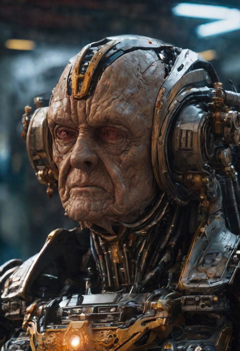 "Robot Mecha Emperor Palpatine" Weight:1 "Masterpiece Photography, detailed, striking, hyper real, super detailed 8k resolution subdued lighting hyperrealistic, hypermaximalist, magnificent, moody eldritch lighting, magical realism, bizarre art, esoteric detailed skin texture, ultra realistic faces, cgsociety, diffused natural skin glow, breathtaking and beautiful, subsurface scattering subdued eldritch lighting, god rays, vapor light, dust magical particles" Weight:1
