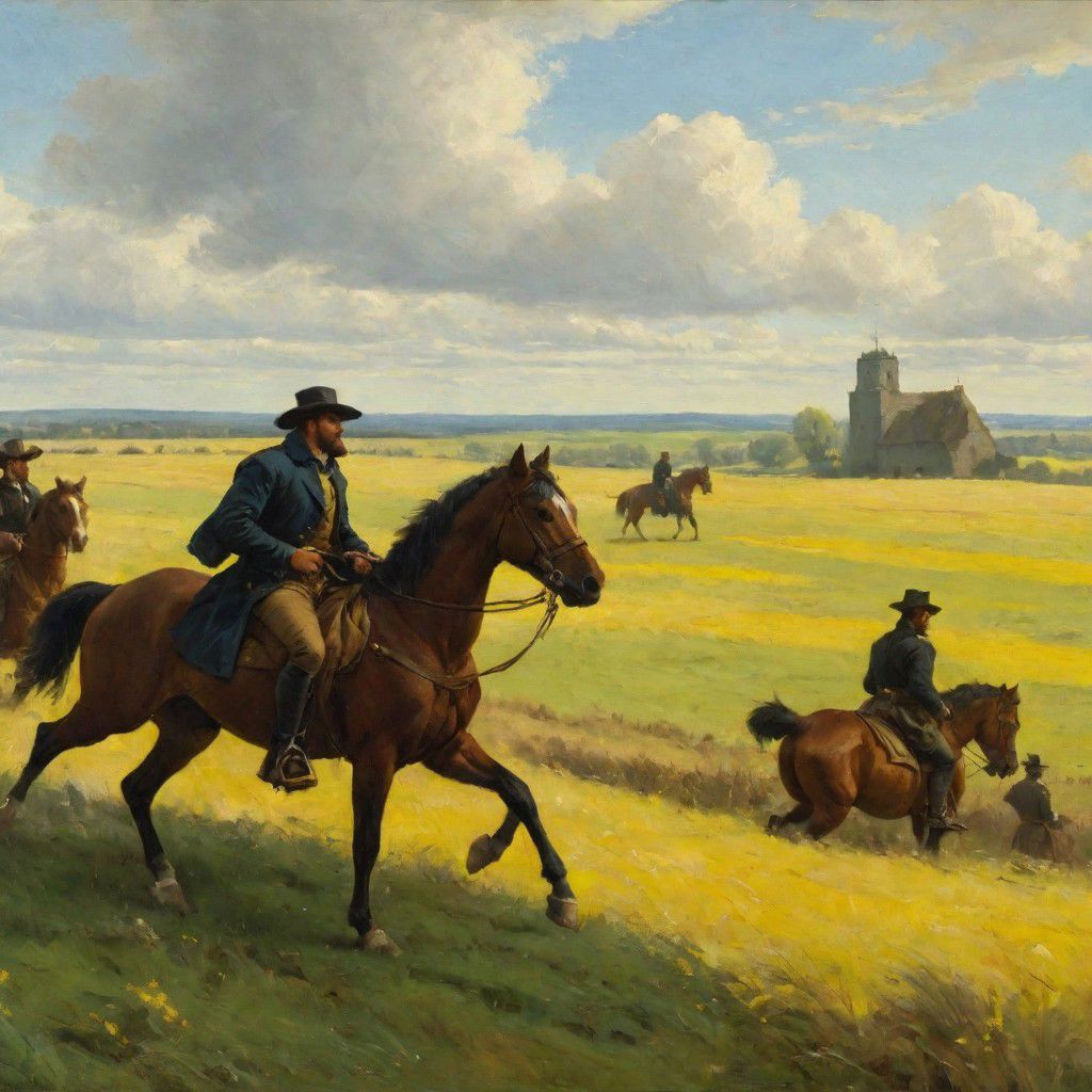 Oil painting, day, green-yellow field of wild grass, side view, 2 persons. In the distance in the center are two men on brown horses. The men are dressed in yoloms and coats with sabers on their sides. The second man has a musket hanging from his back. Further in the field there is a mound, and the blue sky is covered in clouds.