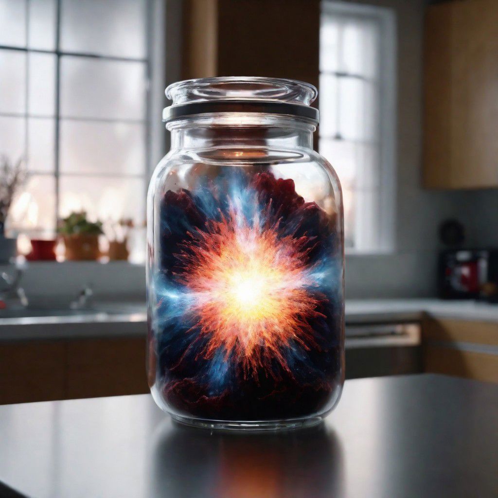 supernova explosion inside a glass jar, the jar stands on the kitchen table, 4K.