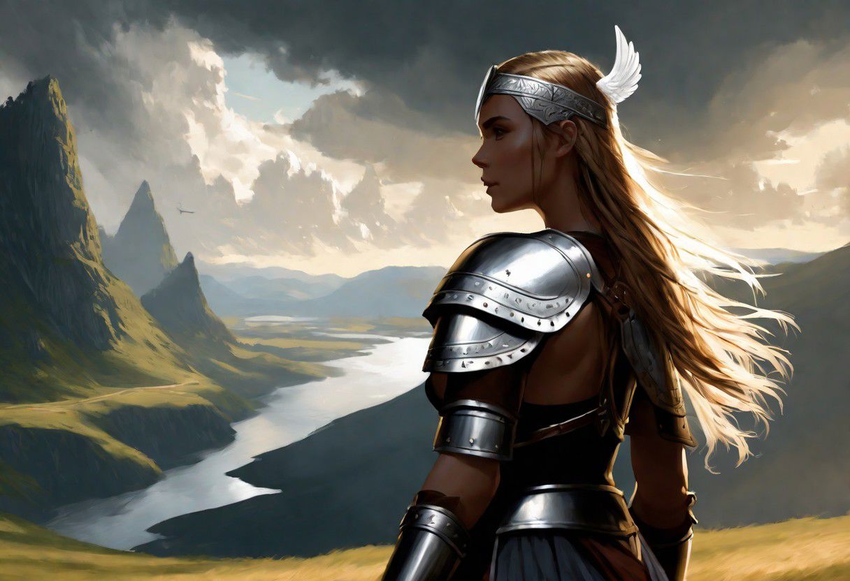 Viking. Valkyrie. Wings. Armor. Female. Male. Long Hair. Landscape Background. Cloudy. Sunny.