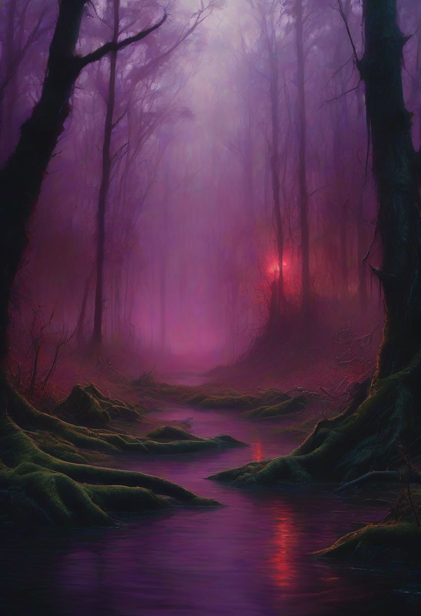 A mesmerizing, hyper-realistic digital painting of a dark and haunting Timberland landscape. The scene is set in a dense jungle, where the shadows of twisted trees loom over a spooky swamp. The water appears to be infected with a mysterious substance, and the atmosphere is filled with an eerie, horror-themed vibe. The colors are predominantly dark and moody, with pops of purple, red, and white that add to the overall creepiness. The artwork is meticulously controlled, with selective focus and a background blur that emphasizes the intricate details. The dramatic lighting, reminiscent of Stephen Gammell's style, casts deep shadows and highlights the dripping foliage. The overall effect is akin to the atmosphere of a scary horror metal music video, enhanced by godrays and a captivating, cinematic atmosphere.