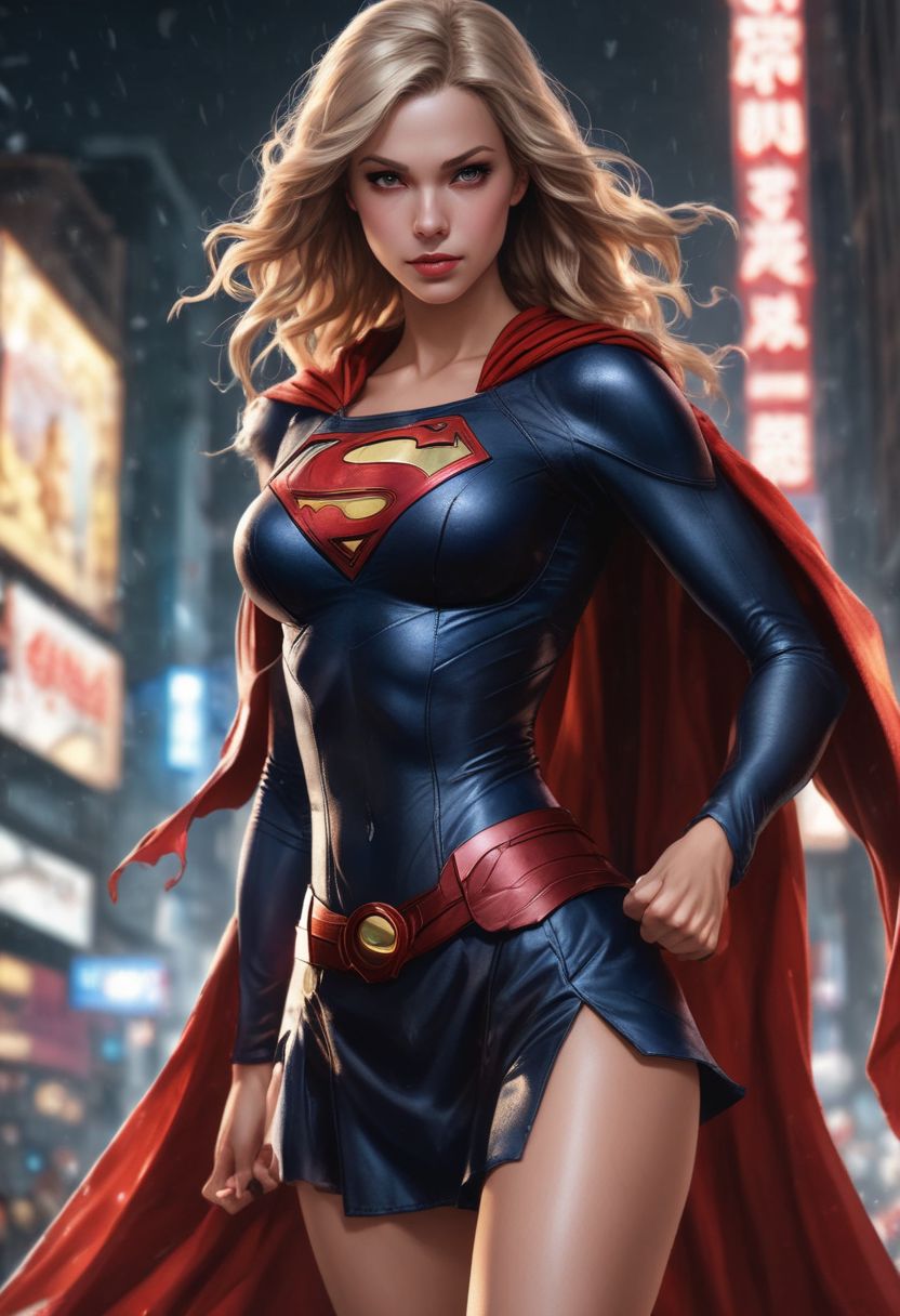 High resolution ultra-realistic of beautiful Supergirl White with wavy blonde hair, Greg Rutkowski, Intricately Designed Handsome cute face, Realistic beautiful blue eyes, Atrractive 21 years old woman, DC Comics, Supergirl standing in a dramatic scene under a full moon on a dirty Gotham City street, full body, exposed body, Intricately Designed tight combat top, red mini-skirt, red cape, sexy body, beautiful firm breasts, 8K, ultra-realistic body, defiant and seductive, Cinematic Lighting, sharp focus, digital painting, Photograph Taken on Nikon D750, Alphonse Mucha, 8K, athletic figure, Hyperdetailed, hyperrealism, aesthetics comics movie