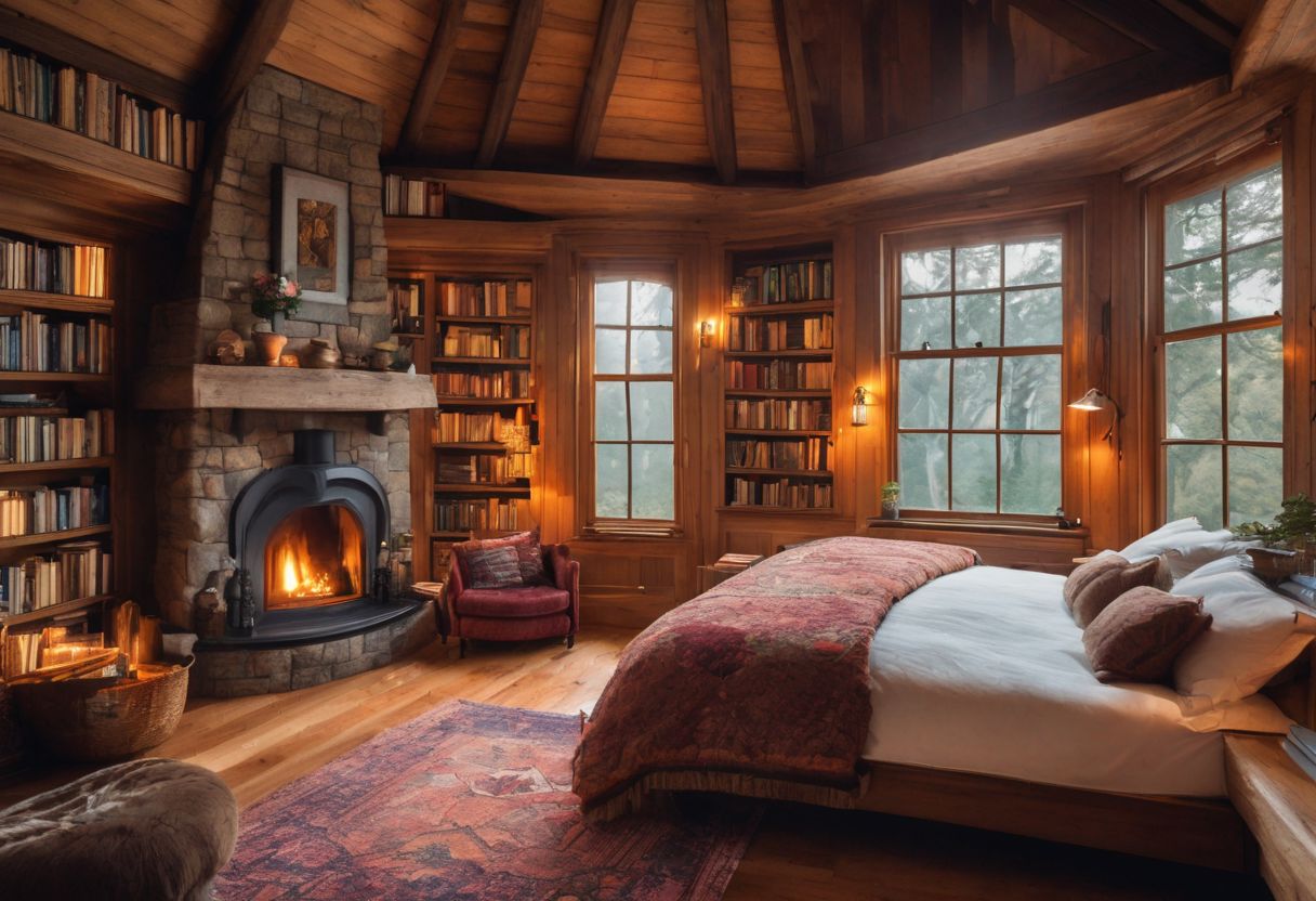 masterpiece, 8k, very high definition, treehouse cosy bedroom, fireplace, Bay window, books, intricate details