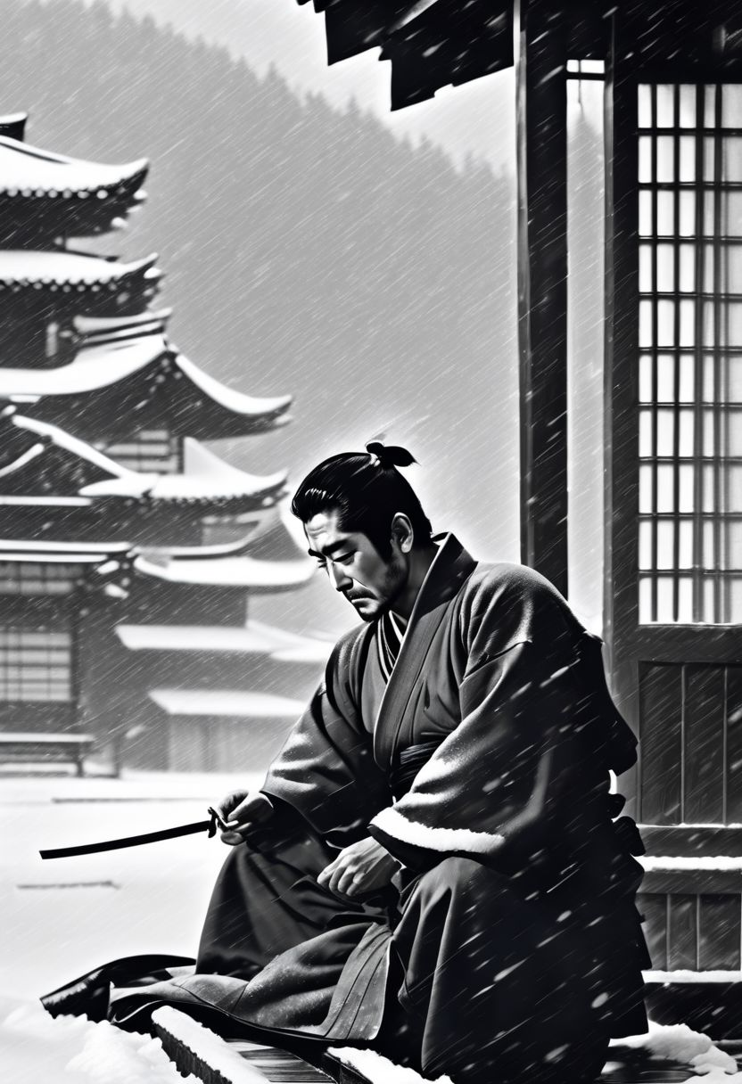 (((/toshiro mifune/))), samurai, yojimbo, smoking tobacco, eyes closed, sitting on a porch, winter storm