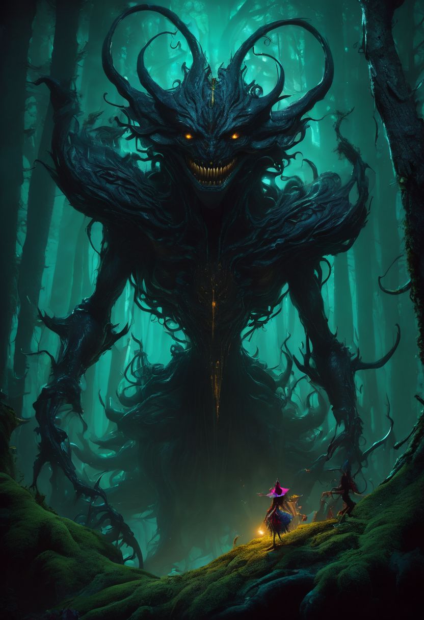 Create image: moody, grainy, noisy, concept art, by Alberto Seveso, Cyril Rolando, Dan Mumford, meaningful visual art, detailed painting, digital illustration, Unreal Engine 5, maximalist, fantasy art, 3d digital art, sharp focus, masterpiece, fine art, Lovecraftian fairy-like anthropomorphic creature, a deformed puppet monster villain, dark fantasy inspired by Alice in Wonderland. Character with extremely intense, unnerving smile conveys a stare of insanity and psychological terror, long mechanical limbs made from natural materials, flamboyant dark evil fantasy aesthetic, psychological horror character with unorthodox body posture, fantasy character art, dynamic pose, 4k, dark forest