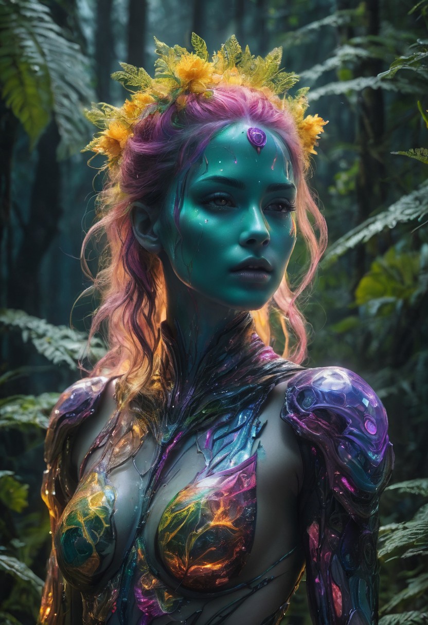a beautiful bionic Sci-Fi female specimen with seductive figure and glowing body and hair, standing, full body, at night wilderness otherworldly planet with colorful glowed and unique undiscovered slime-ish weird flora, looking at viewer with her piercing beautiful intricate detail eyes, 32k, highest quality, UHD, ultra detail, ultra sharp, extremely high quality, ((extremely high quality (face, eyes, skin, skin fidelity, skin texture, skin dentation, hands, hand, fingers, feet, legs)):1.6), extremely detailed background