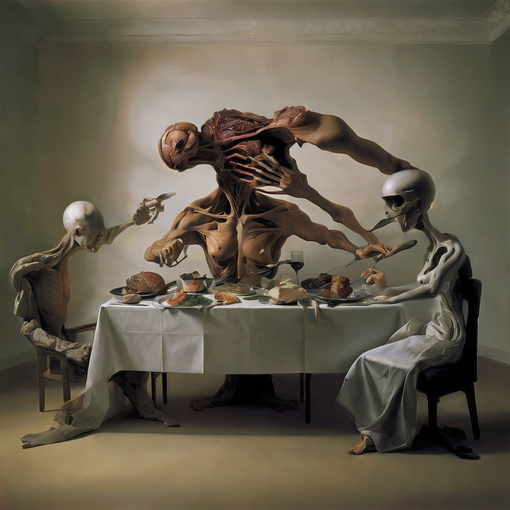 dalidinner confusing situation of morphing anatomy around an impossible dinner table in a surreal abstract scenario