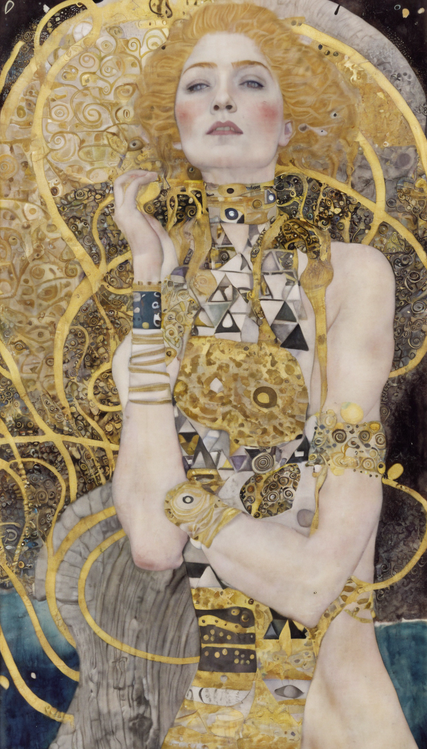 <lora:kl1m:1>kl1m whl3 woman with golden hair, eyes, spirals, triangles, whale <lora:add-detail-xl:1>
