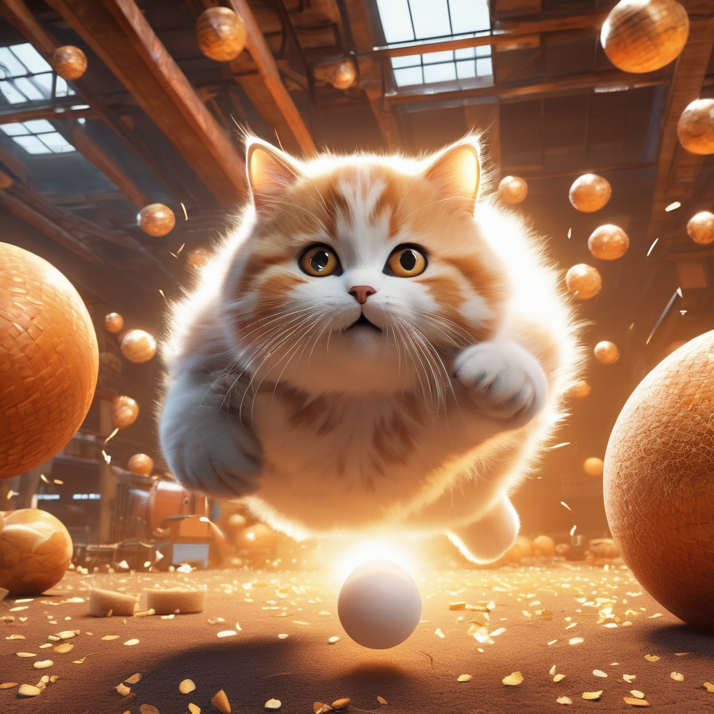 a fat bouncy kitten whose belly is a big rubber ball is bounding about in a firework factory, ball cat, cat made out of a ball, cute, adorable, orange and white fur, rubbery, round, bulbous, playful, playing with coconuts, high flying, aerial, ricochet, action, dynamic pose, intricately detailed background, sharp focus, 8k render, masterpiece . award-winning, professional, highly detailed