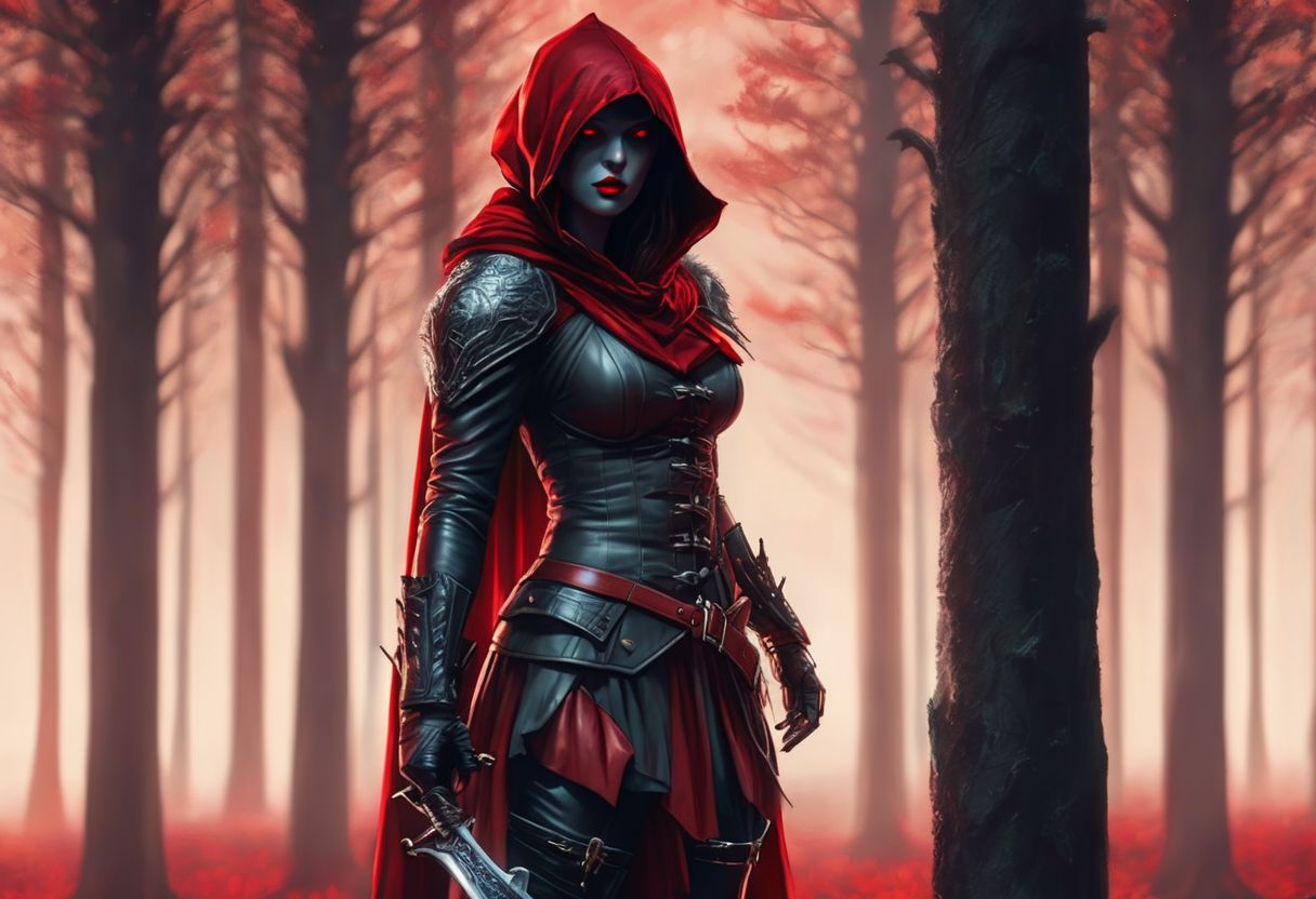 extremely beautiful large breasted red riding hood, subtle makeup, golden hour, photorealistic, high contrast, 8k HD, detailed, hyper-detailed, realistic skin texture, covered with red hood, big breast, best quality, ultra high res, raw photo, dramatic lighting, unreal engine, diffuse glow, intricate red hood, outdoor, realistic detailed dark forest, holding sword, facing the viewer full body shot,