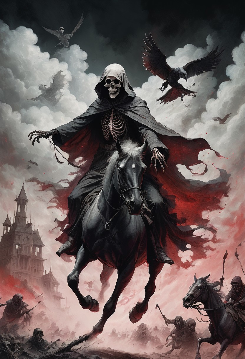 Double Exposure: The spectre of female death, the grim reaper nun riding on his pale horse, forming a huge cloud of ghostlike dust as he charges through touching those he passes with his pale finger. A massive cloud of skeletal dust and undead skeletons and zombies form the backdrop, with a slapchop style. Intricate detail. Cloak tattered and flapping in wind. Background: moonlit sky, blood red circle