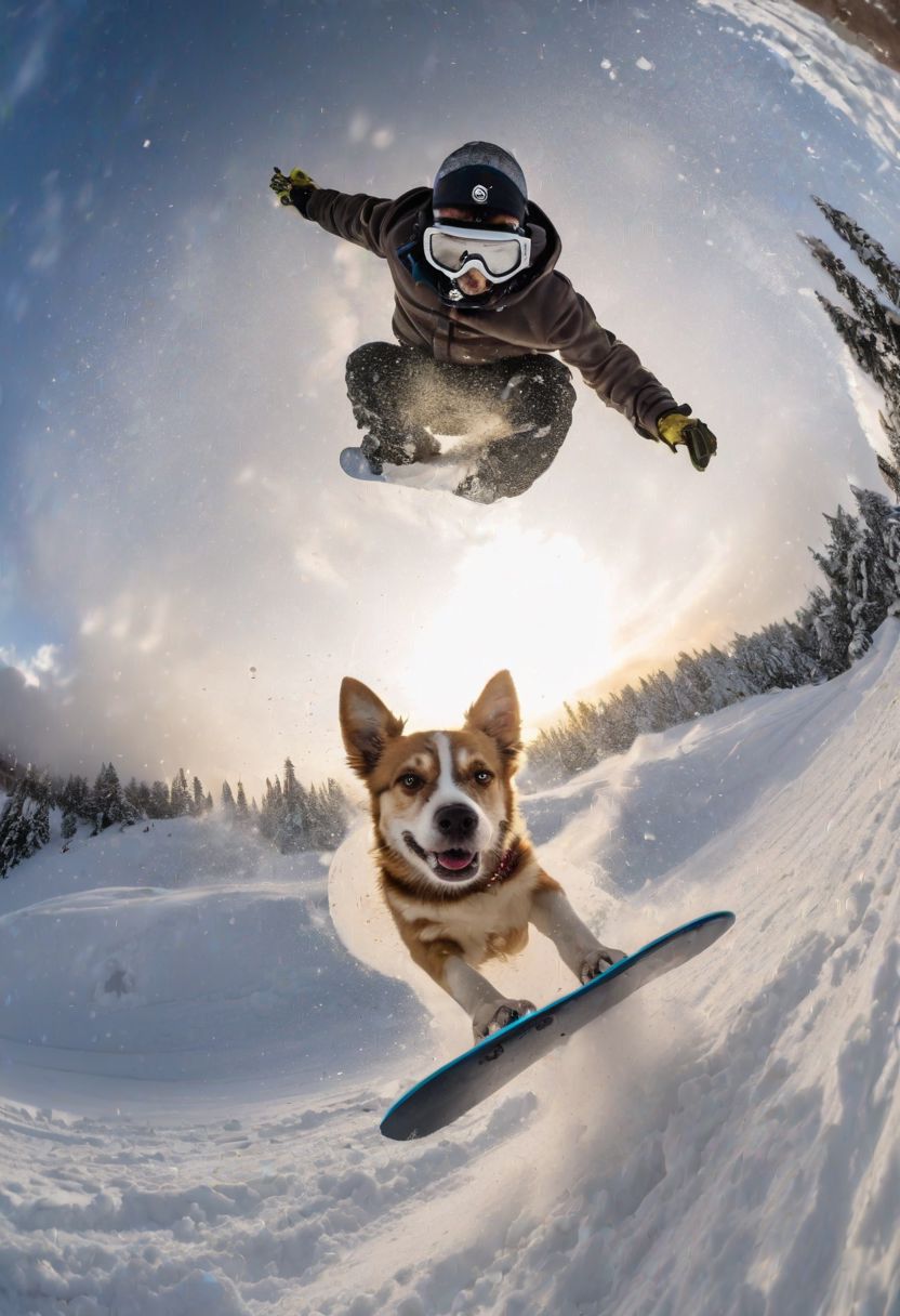 dog snowboarding, backflip, amazing sports photography, sunny rays, awesome, fish eye lens, dynamic style, visual effect, snow splashing, high speed photography