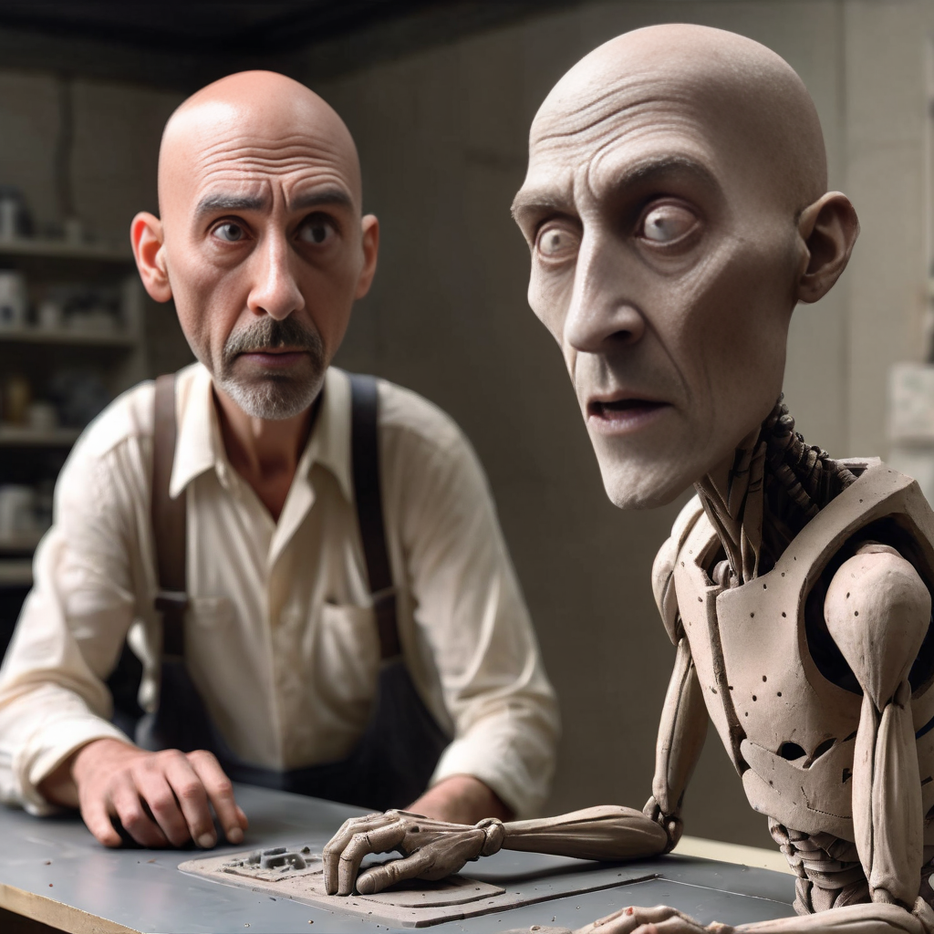Centered medium film shot, of JRR01, bald 40yr old man made of clay, and tech engineer with pocket protector, staring at a strange machine on desk <lora:JRR01_XL:0.8> <lora:Clay Animation:1> Clay Animation page