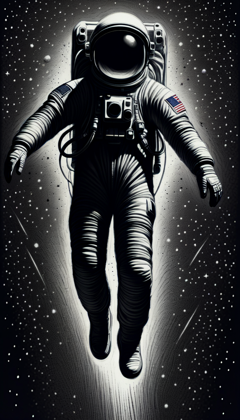 monochrome greyscale noise grainy dirty charcoal drawing of <lora:CharcoalDarkStyleXL:1>CharcoalDarkStyle man astronaut floating in space dark black background black vignette