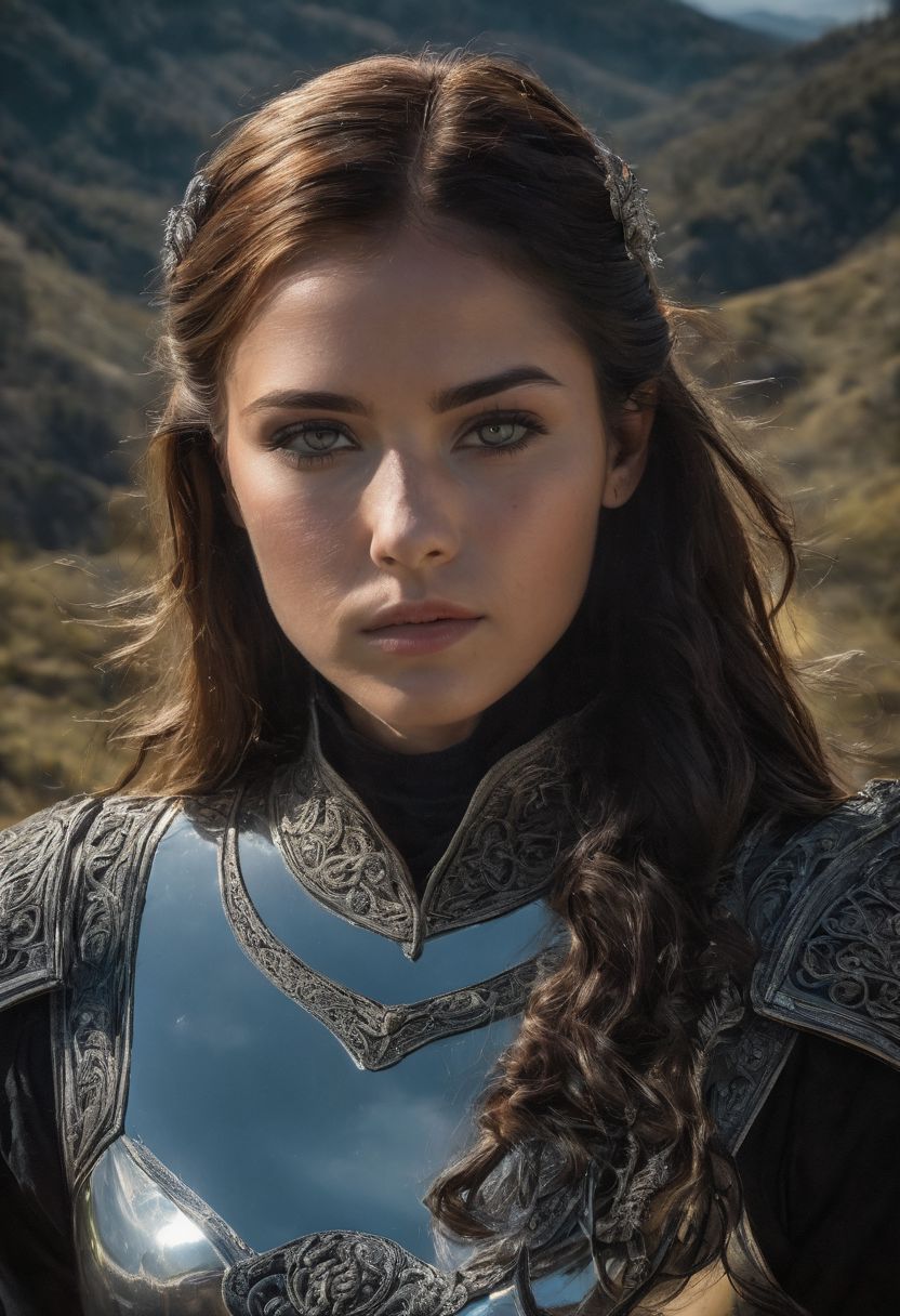 A stunning portrait of the sultry busty Archer Temptress Warrior on a quest to find the Golden Mystical Bow, Glimmering, Harmonious, masterpiece, walking through the valley of death, Shadow play, light, moody, mysterious, glossy hair,vivid, Abstract Neoralism, cinematic, Film light, Hyper detailed, Hyper realistic, masterpiece, atmospheric, High resolution, Vibrant, High contrast, dark angle, 8k, HDR, 500px, FUJIFILM, bokeh, hdr, award winning lighting,