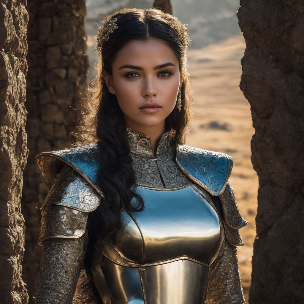 A stunning portrait of the sultry busty Archer Temptress Warrior on a quest to find the Golden Mystical Bow, Glimmering, Harmonious, masterpiece, walking through the valley of death, Shadow play, light, moody, mysterious, glossy hair,vivid, Abstract Neoralism, cinematic, Film light, Hyper detailed, Hyper realistic, masterpiece, atmospheric, High resolution, Vibrant, High contrast, dark angle, 8k, HDR, 500px, FUJIFILM, bokeh, hdr, award winning lighting,