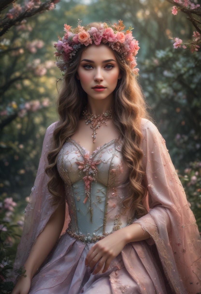 8k model photography of a young woman,the faerie queen of spring wearing a crown of flowers in her hair, beautiful and surrounded by vibrant magic