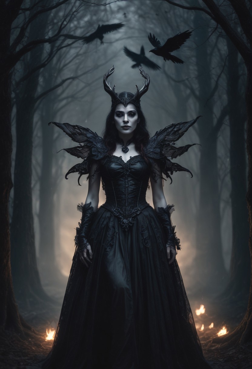 8k model photography of the faerie queen of night wearing a dress of shadows and darkness, beautiful and surrounded by opaque magical darkness and has a raven on her shoulder