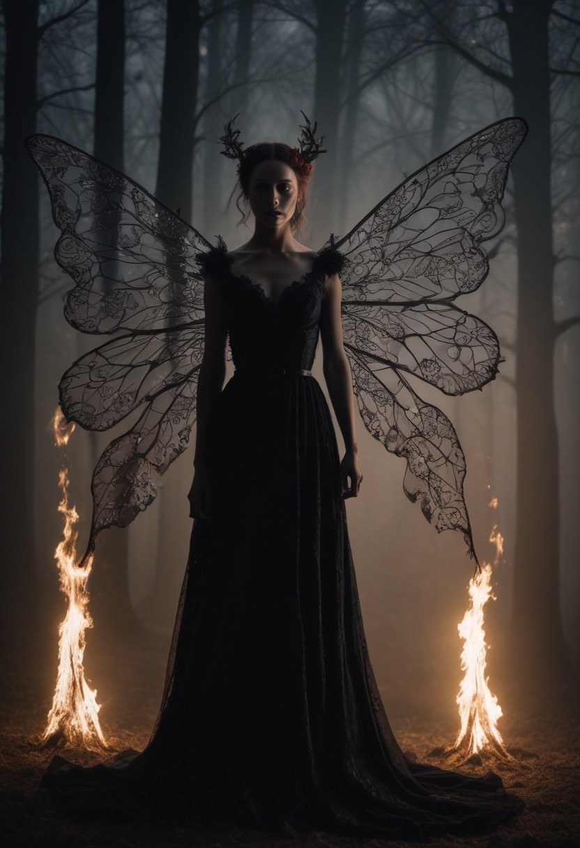 8k model photography of a young faerie wearing wearing a black dress of shadows and darkness, dreamy and surrounded by darkness and shadows during a dark moonless night