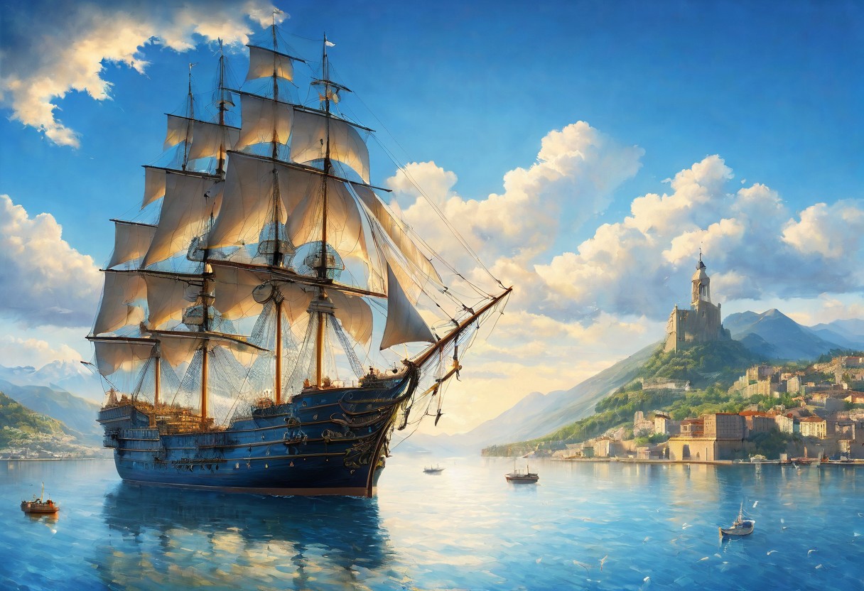 a sailing ship, tall hull, clear blue sail, bright blue sky, mountains((clouds)), sky(clouds), city, port, birds flying over the port, impressive, epic, magnificent, sun rays, organic tracery, in the distance.
