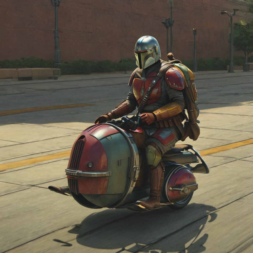 a mandalorian motorscooter, MNDLR, MNDLR STYLE, wearing a backpack, on his way to college, no parking anywhere, very frustrated, just brokeup with his girlfriend, sad and lonely, highres, masterpiece, 8k, 4k, <lora:mndlr:1>
