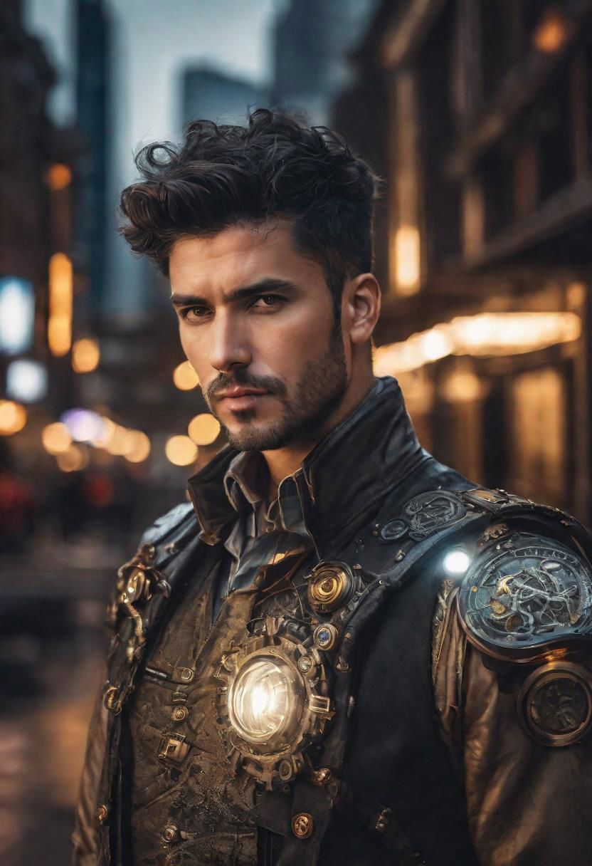 ultra realistic portrait of a man, steampunk theme, short black hair, wearing a mechanic armor, engineer, steampunk themed city background, symmetrical eyes, (dark atmosphere, night:1.2), fine details best quality, hyperdetailed face, photorealistic, highest quality, best shadow, high contrast