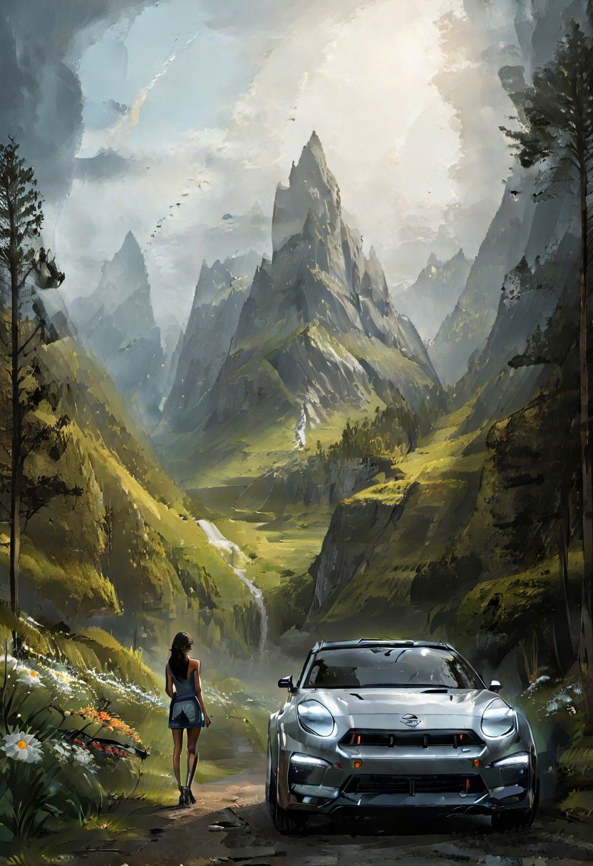 digital art, NISSAN, mountail landscape backgound, plants tress and flowers, a girl standing nearby the car
