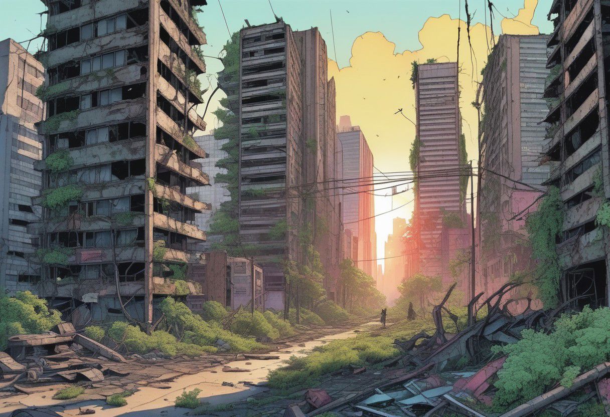 ink on parchment, post-apocalyptic, landscape, broken skyscrapers in overgrown city ruins, sunrise, extremely detailed, spring, color