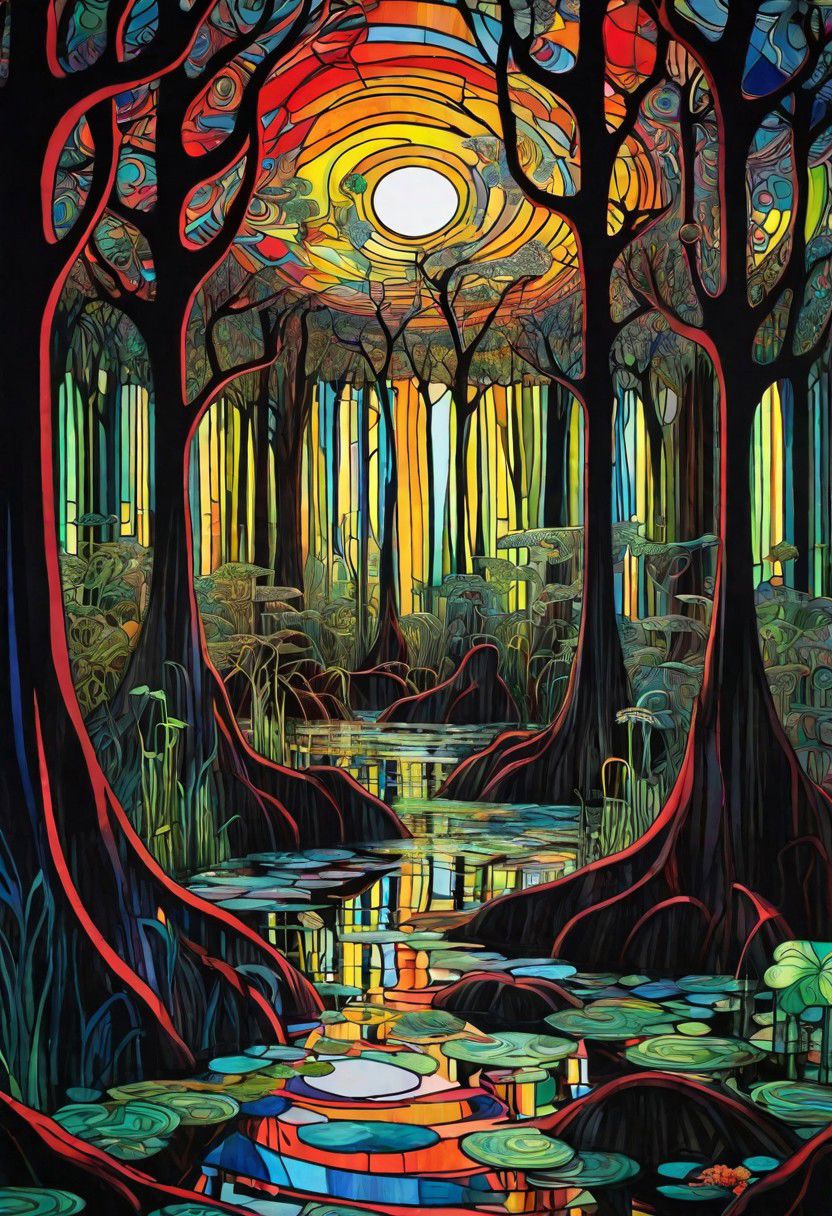 psychedelic Swamp,Stanley Donwood, stained glass, Klimt, Junji Ito, stylized, pattern, soft, dynamic lighting,