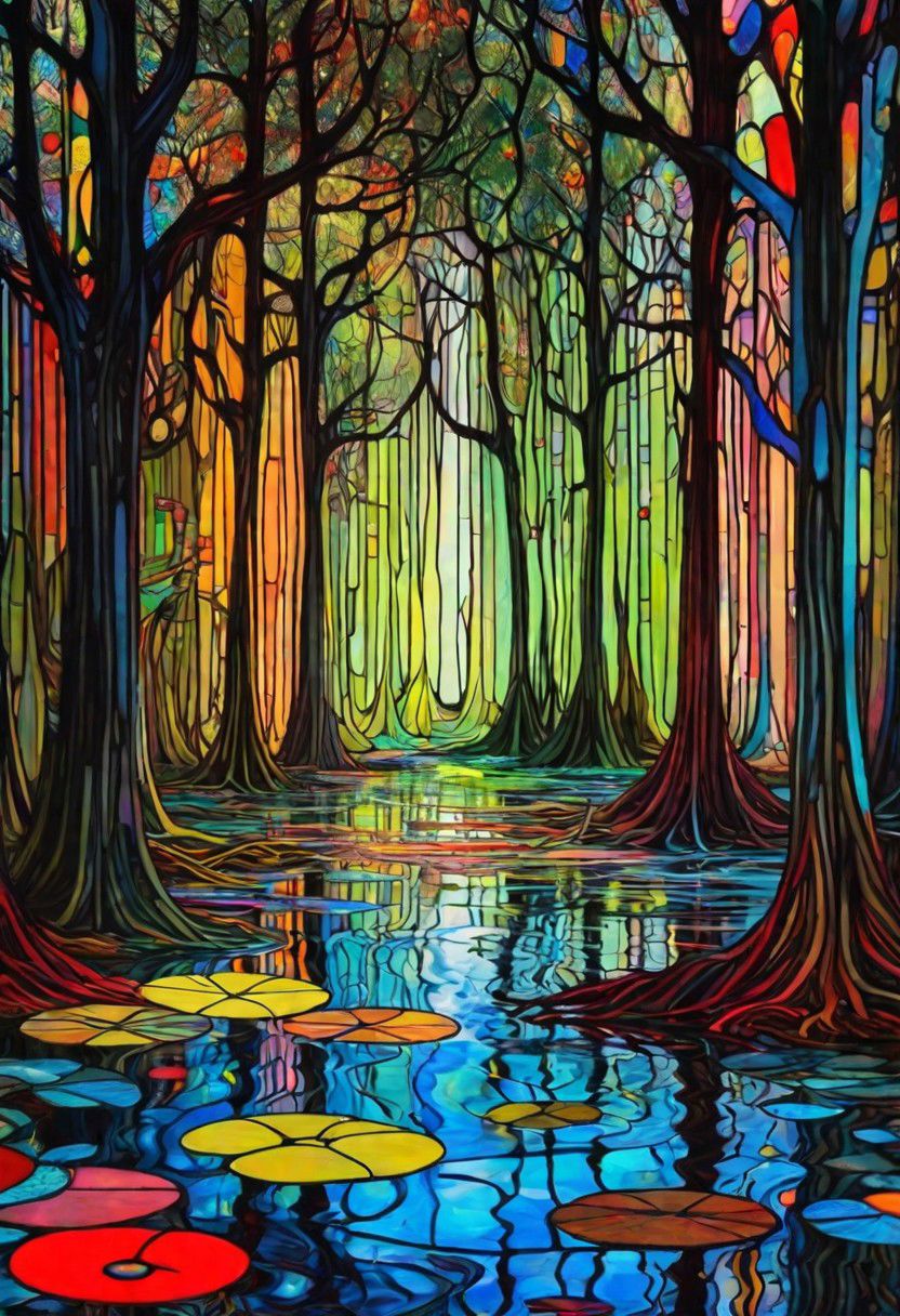 psychedelic Swamp,Stanley Donwood, stained glass, Klimt, Junji Ito, stylized, pattern, soft, dynamic lighting,