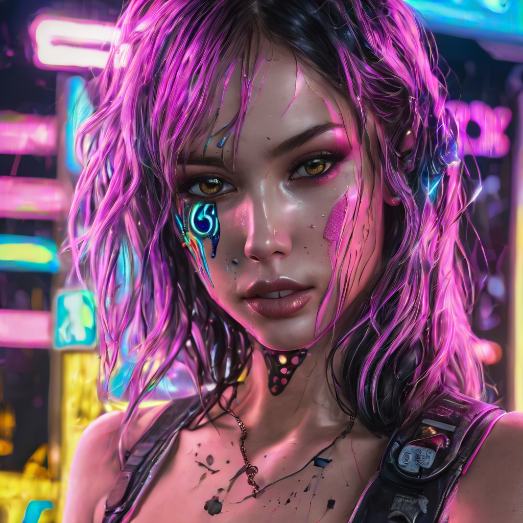 cyberpunk strip club, close up of 18 year old raver girl under a sign that says the words "FUCK ME", skimpy slutty clothes, mascara eyeliner, blacklight uv, psychedelic, hdr, 8k, photorealistic, highly intricate, absurdres, looking at viewer crying sad makeup dripping down face, detailed, realistic, 8k uhd, high quality masterpiece highest quality