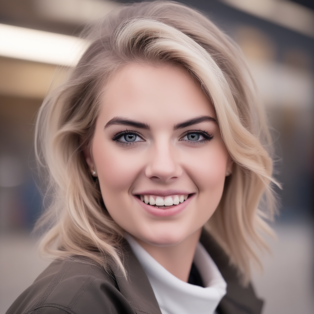 professional fashion close-up portrait photography of a young beautiful ((ohwx woman)) <lora:Kate Upton:1> at outdoor supply store during Noon, Nikon Z9