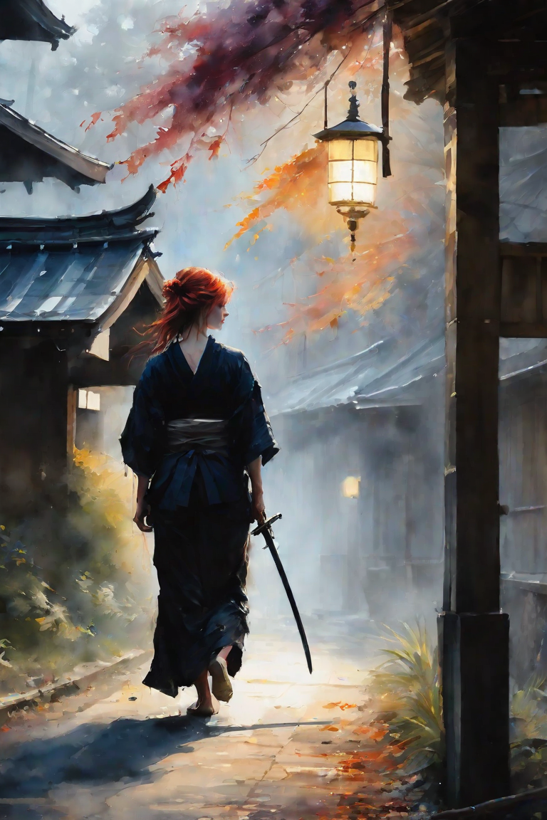 high quality, 8K Ultra HD, highly detailed, masterpiece, A digital illustration of woman style, woman style, (((magician beautiful woman, samurai woman, no japan, walking on the street in Kyoto, normal city life on the street, dressed mini short black kimono, (((He carries a katana samurai sword on his back, a la The Witcher))), beautiful slim legs, slim beautiful body))), ((beautiful face)), Fantasy, magic, fairy, like a fairy tale, watercolor, wash technique, colorful, A painting with dripping and scattered paint, Painting like Agnes Cecile, blurry, pale touch, smudged outline, light touch face, a little smile, luminism, beautiful gray eyes, messy white old clothes, Albert Anker, John Howe, Joaquín Sorolla, Agnes Cecile, 3d render, octane render, cinematic, by yukisakura, Isometric, awesome full color, <lora:xl_more_art-full_v1:0.35>