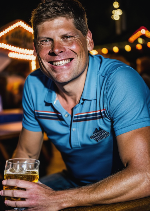 <lora:more_details:0.3> highres, very detailed, masterpiece, realistic, 1man, jan_ullrich, smile, night, oktoberfest, happy, laughing, drinking a beer, night, lights, shirt, blue jean, sit, half top body, 40 yo <lora:jan_ullrich-000007:1>