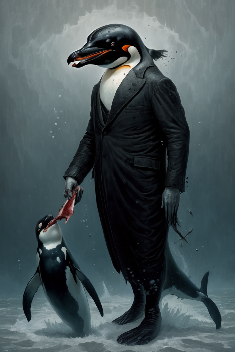 masterpiece art by Bas Waijers, by Gerald Brom, (penguin as bloody murderer with butcher knife killer whale gore and meat parts under his legs), Gothic Horror, Dark Fantasy, romantic, depression, melancholy, anguish, surrealist, hyperrealism, <lora:Bas_Waijers_-_Artstyle_Style_SDXL:1>, <lora:Gerald_Brom_XL_-_Dark_Fantasy_Art:1>