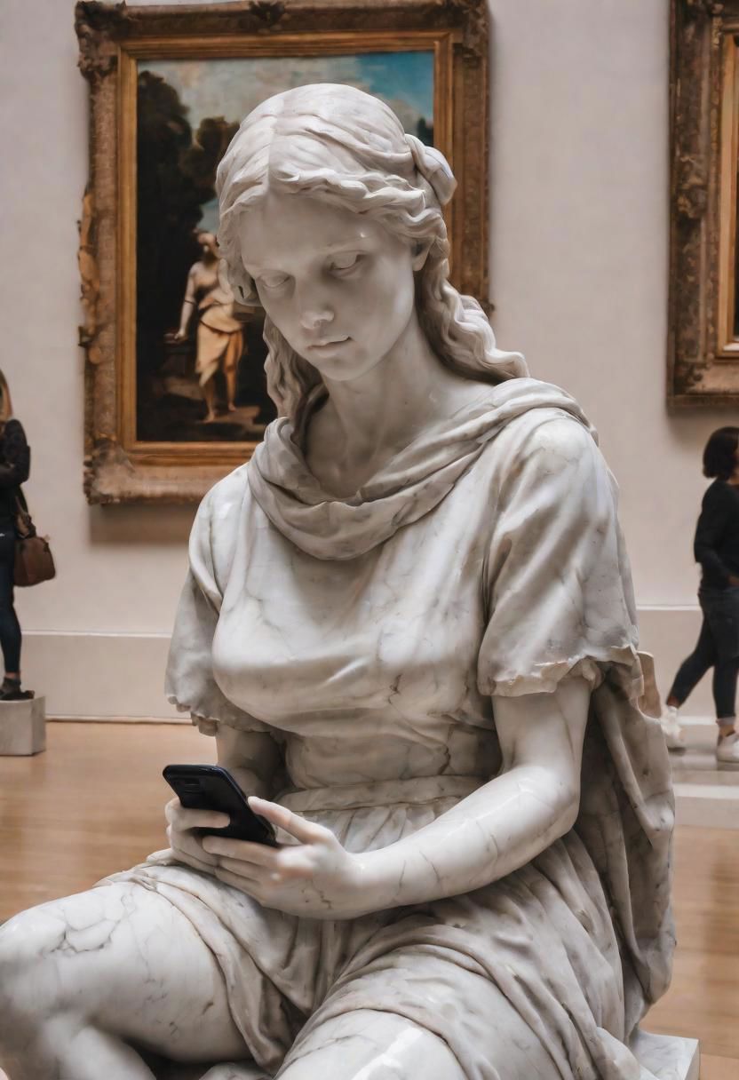 Marble statue of a girl looking at her phone, sitting inside a museum filled with paintings.