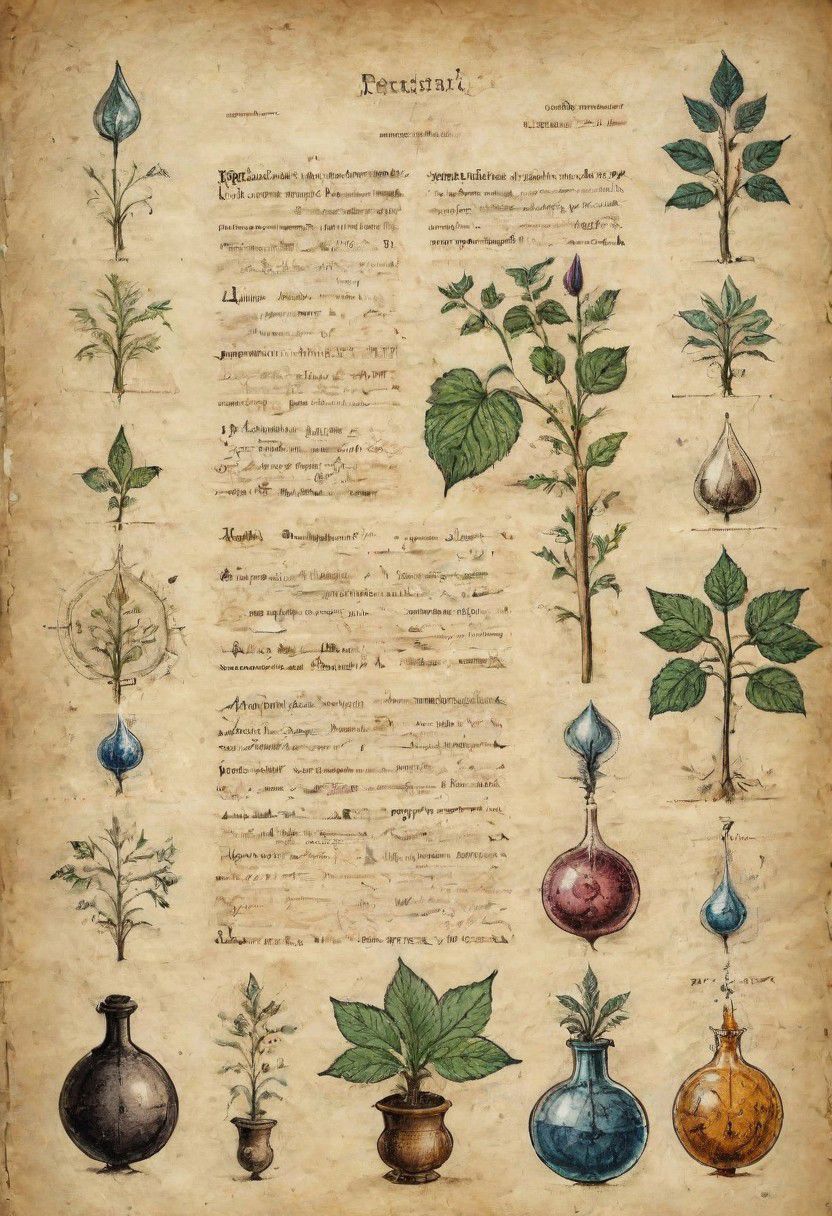 on parchment, ink illustration, an alchemical manuscript with illustrations of plants