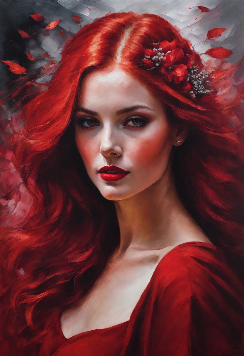 "Crimson Captivation" delves into the captivating power of red. The woman, with her alluring red locks, becomes the focal point against a backdrop of crimson hues. The composition transforms her into a visual symphony of red, drawing viewers into the mesmerizing charm of the scarlet spectrum.