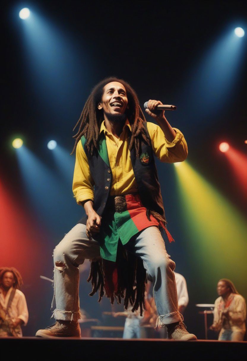 create high quality image of Bob Marley, in concert, on stage, stage lights, spot lights, dreadlocks, performing, singing,