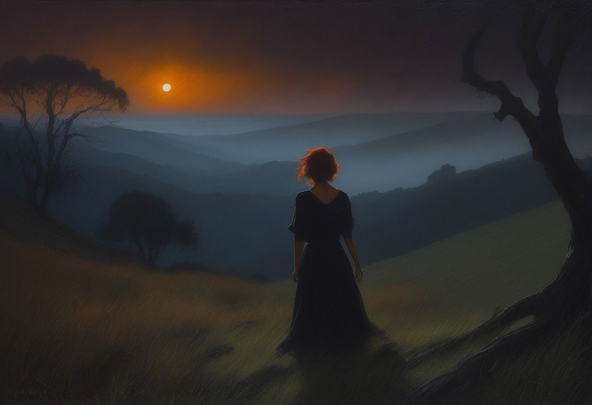 Wide shot of Rinze Morino under decaying tree on hill. Very Dark Night. Very Dim dark-orange Light from side. Long Grass. Dim Silver Moonlight. Dark valley in background. Thick Fog in valley. Standing Close to Gate. Dancing energetically. Celebrating. Arm raised. Laughing. Very Short messy Dark-Red hair with side-parting and undercut. Very Tanned Skin. Shoulders. Implied-nude. Small breasts. Oil Painting. (appropriate shadowing), (appropriate direction of light), Very Dark background.