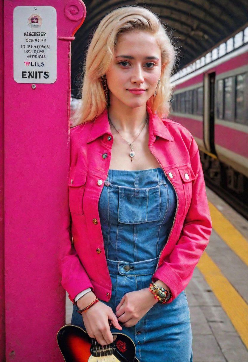 (((best quality))), (((train compartment))), (((from side))), (carrying a guitar case on behind:1.15), fashion pattern pink T-shirt, ((red jacket)), navigation sign, 1girl, smile, walking, headphones, ribbon, blond twintails, collarbone, cleavage, (big tits), skirt, sweat, shy. blush, slim figure, thin waist, exit, (((masterpiece))), (((best quality))), (((half body photo))), solo, 1girl, longhair, cleavage, big tits,Analogic photo,90s style